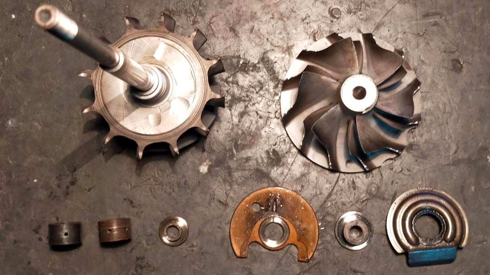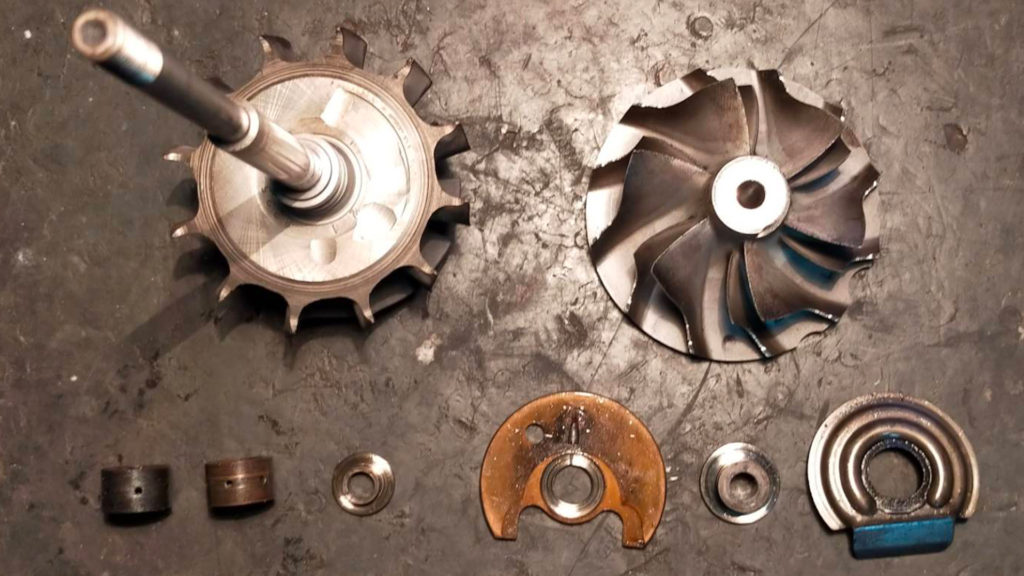 ノーマルの鋳造に比べ堅く、軸がスラスト方向に動きコンプレッサーホイールがコンプレッサーハウジングに干渉した場合、ノーマルの鋳造であれば柔らかい為に羽根が削れながらもタービンは回転しますが、堅い鍛造の場合は、ハウジングに当たった段階で羽根はハウジングに食い込み・その場で止まろうとします。